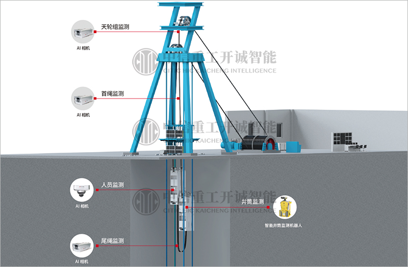系統主要包括井筒巡檢機器人、罐籠無線可視裝置、首尾繩AI視頻智能監控裝置、提升機載荷監控裝置等。